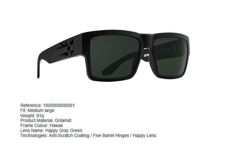 Spy Cyrus sunglasses feature a bold design, ultra-thick sides, and a striking front. They come with Happy Lens™ technology to boost your mood and energy levels. These square-framed sunglasses are perfect and feature a Hawaii frame and Gray/Green polarized Happy Lens, making them perfect for any adventure, whether on the beach, hiking in the mountains, or enjoying a sunny day.