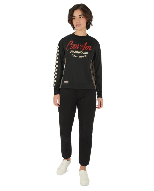 Gear up for your off-road adventures with the Women's CAN-AM x FH Jersey. Constructed with 100% polyester, this jersey offers a perfect blend of comfort and durability. The high-quality silk-screened graphics showcase your style while the moisture-wicking materials keep you dry and comfortable all ride long. Featuring mesh vent paneling on the sides and under sleeves, airflow is optimized for peak performance. The athletic fit and drop tail on the back panel ensure a secure and tucked-in feel, while the overlocked stitching provides superior durability. Ride in style and comfort with this sleek off-road jersey.