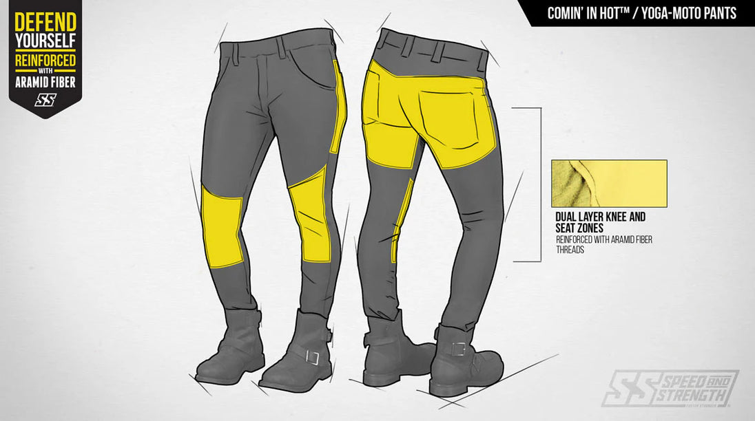 The Speed and Strength® Comin’ In Hot™ Yoga Moto Pants are built with an AR300 Super Stretch Fit Frame with the knee and seat reinforced with Aramid Fiber Thread. The Yoga-Moto Pants have a moderate stretch in comparison to typical yoga pants or leggings. This is due to the protective Aramid Fiber Thread that is built into the pants for abrasion protection.