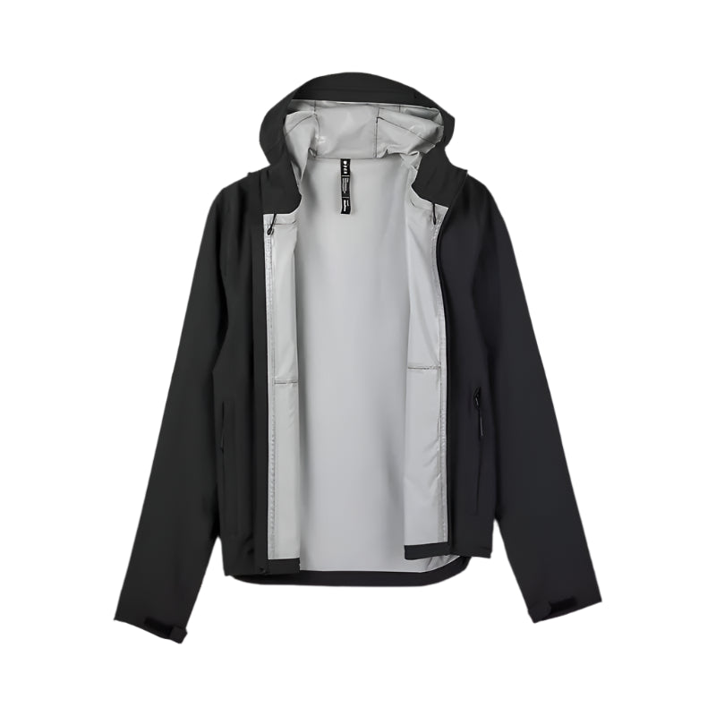 Jacket fully packable into the wearers left pocket with bungee adjust to pack tightly