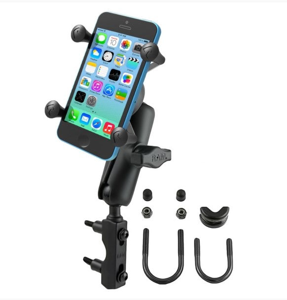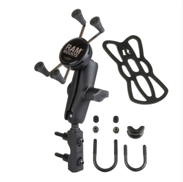 The RAM-B-174-UN7U consists of hardware for mounting to either brake/clutch reservoirs and rails that are 0.5" to 1.25" in diameter, double socket arm and universal X-Grip® cell phone cradle. Designed into the mount is a 1" diameter patented rubber ball and socket system with adjustment points at both ends of the socket arm; this with a twist of the arm knob, allows you to move the X-Grip® mount to your optimum viewing position. The mounting hardware for brake/clutch reservoirs includes both standard and metric mounting bolts. The included X-Grip® cradle has a clean and clever four leg design that sports great holding power without hiding your phone behind foam pads and plastic. The spring-loaded X-Grip® cradle expands and contracts, allowing for a perfect custom fit of your cell phone. The perfect complement to the modern sleek interior of today's vehicles, the RAM X-Grip® is the cell phone cradle evolved.
