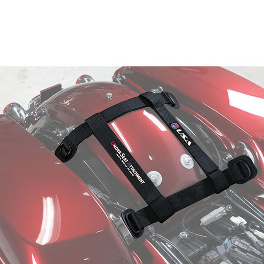 NELSON RIGG ROUTE 1 USA UNDER SEAT ATTACHMENT For use when you don't have a backrest or luggage rack 4 heavy duty self-fastening straps 4 metal D-rings for attaching straps and hooks Fully adjustable to fit...Regular price $42.95