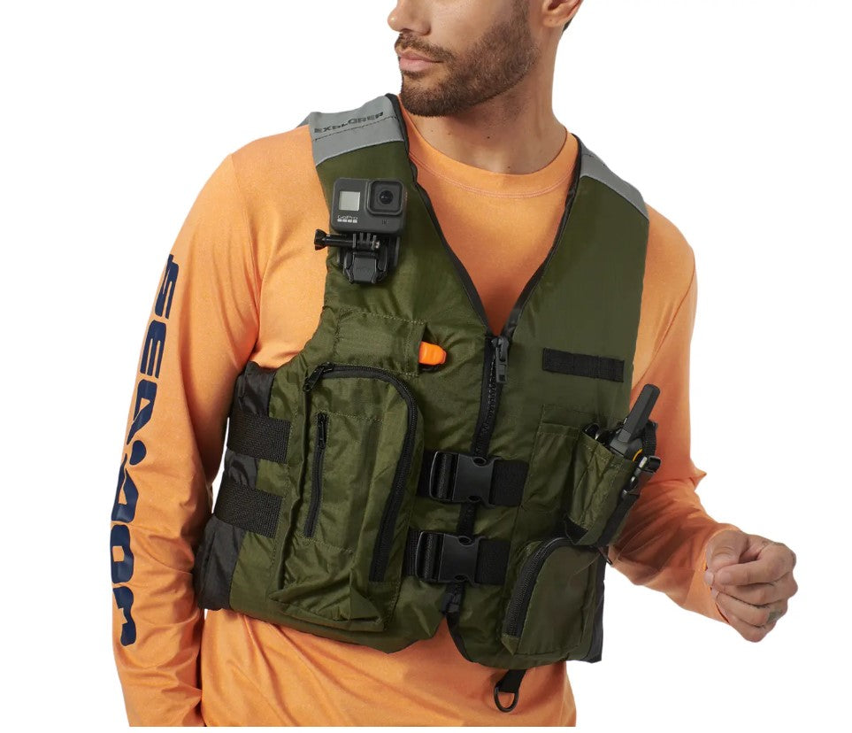 Get outside while staying safe in the Sea-Doo Explorer PFD Life Jacket. Built to last with serious outdoor explorations in mind, this PFD is crafted with expandable polyethylene foam encased in heavy-duty, rip-stop nylon material. Make sure you have your camera ready in the camera mount, while you can move easily thanks to large-cut armholes. Plus, sitting comfort is enhanced with the segmented foam pad at the back. Other key features include multiple storage pockets so your essentials are close at hand, and an easy-access loop at the back of the neck to attach your goggles to. Grab this Coast Guard approved PFD and enjoy the great outdoors!