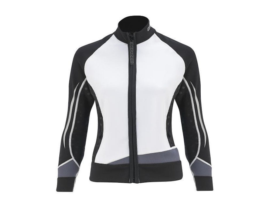 Lightweight 1 mm neoprene jacket for use with the Deluxe Wetsuit or separately to take the chill off evening rides and cooler days. Luxury jacket features front zipper. Front pockets with Velcro closures, underarm zipper venting and reflective prints on the shaped sleeves on ladies’ jacket
