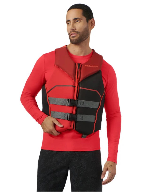 Say hello to your independence from uncomfortable, cumbersome PFDs with the Sea-Doo Freedom PFD Life Jacket. Eco-conscious ecoprene material is made without rubber and designed to dry quickly without extra weight from the PVC and expandable Polyethylene insulation. Give your back an extra boost thanks to the extra foam padding in the lumbar comfort zone, which minimizes lower back pressure and adds support while you're sitting. Other key features include a quick-drying, water draining mesh panel, YKK front zipper, large-cut armholes for maximum range of motion, and stretch side panels. Grab this Coast Guard-approved PFD for your next water adventure.