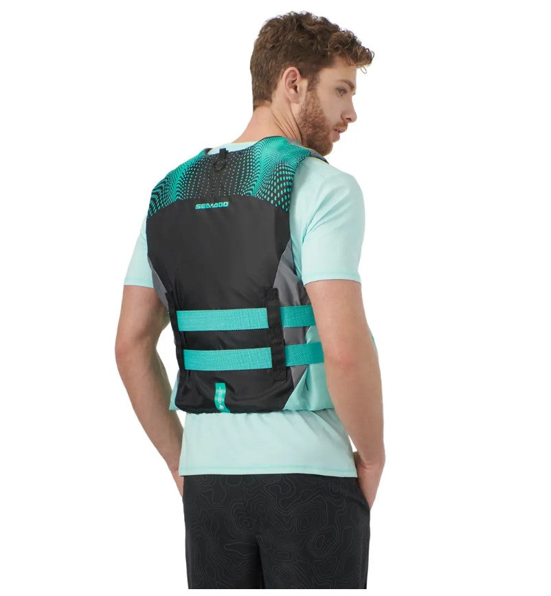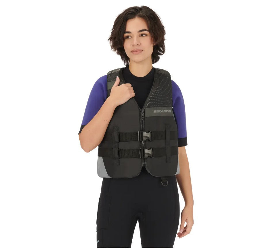 Objects in motion will keep it moving safely in this PWC Life Jacket. The Sea-Doo Motion PFD Life Jacket is made for ease of movement with large-cut armholes and lightweight, expandable polyethylene foam inserts. Wear and tear is no match for the heavy-duty polyester shell, which boasts added bonuses like a goggle-attachment loop at the back. Plus, this made for action Sea-Doo PFD is Coast Guard approved.