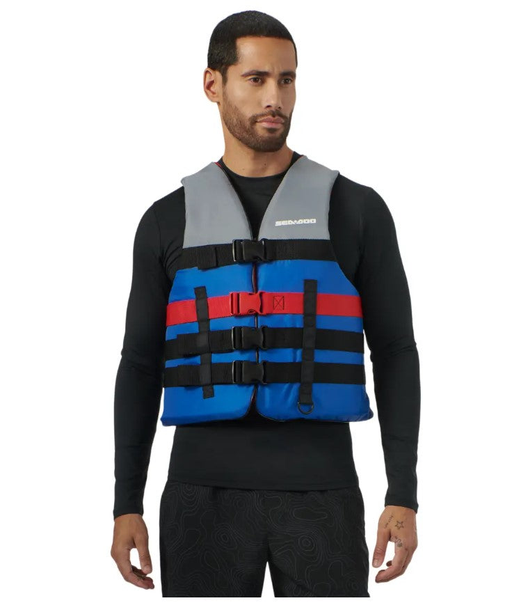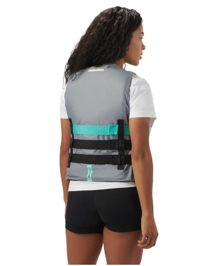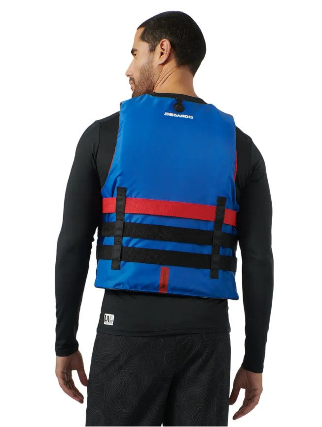 Navigate your favorite lake activities in this unisex PWC life jacket. The Sea-Doo Navigator PFD is a unisex life jacket that's crafted from a lightweight and quick-drying polyester shell with expandable and comfortable polyethylene foam inserts. The dual-sized design makes sharing easy, Plus, large-cut armholes allow for a full range of motion. Completing this Coast Guard-approved Sea-Doo PFD are features like a goggle attachment loop and key lanyard D-Ring.