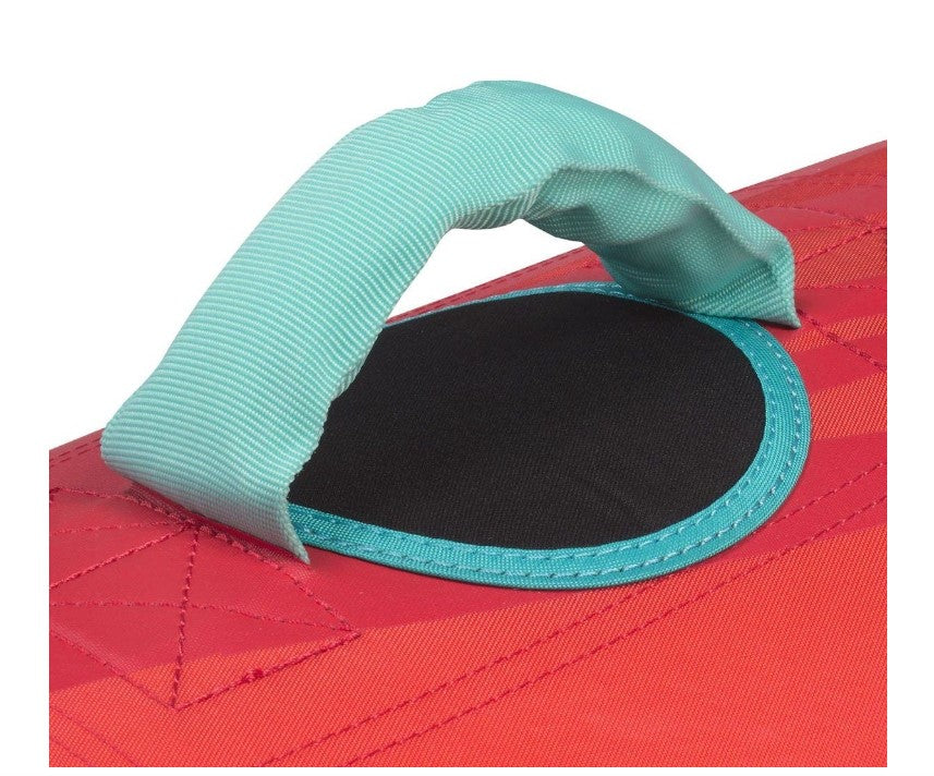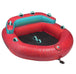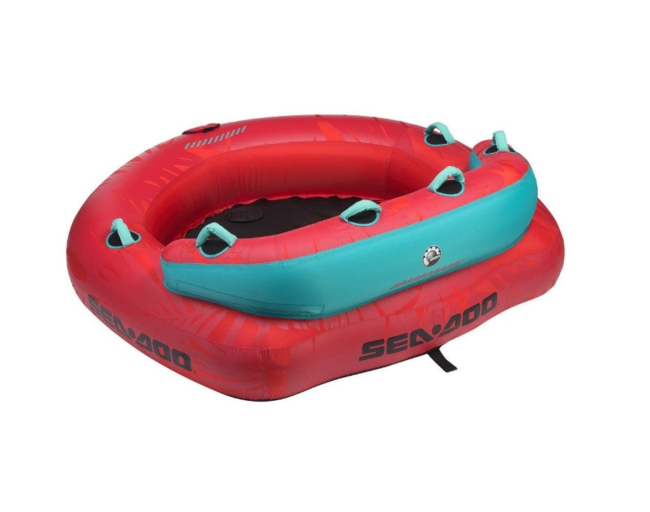 Designed for two persons. Multiple sit-in riding positions, sitting with their back against the backrest or on their knees. Can be pulled from the front or the rear depending of the choice of your riding position. 24-gauge robust PVC bladder with 840/420 deniers heavy-duty full nylon cover. Includes soft foam area for sitting and foam knuckle-protection pads to avoid chafing. 4 self-bailing drain vents. Tow system reinforced with 840 deniers nylon. Quick-connect tow hook. Padded valve cover. Puncture repair kit. 2 Boston valves and one normal air valve in floor. Dimensions: 68in. x 67in. ( 172 cm x 170 cm) when inflated.