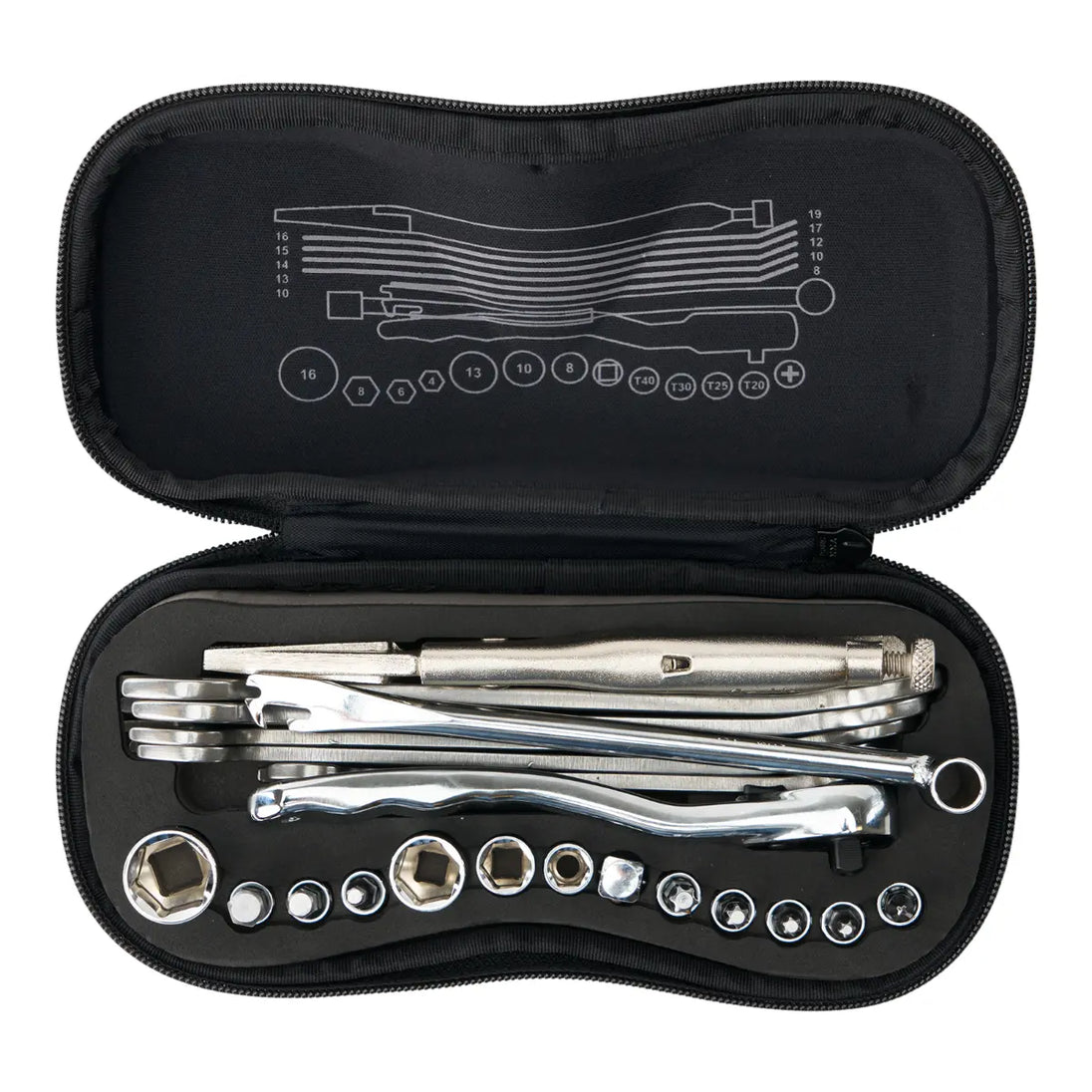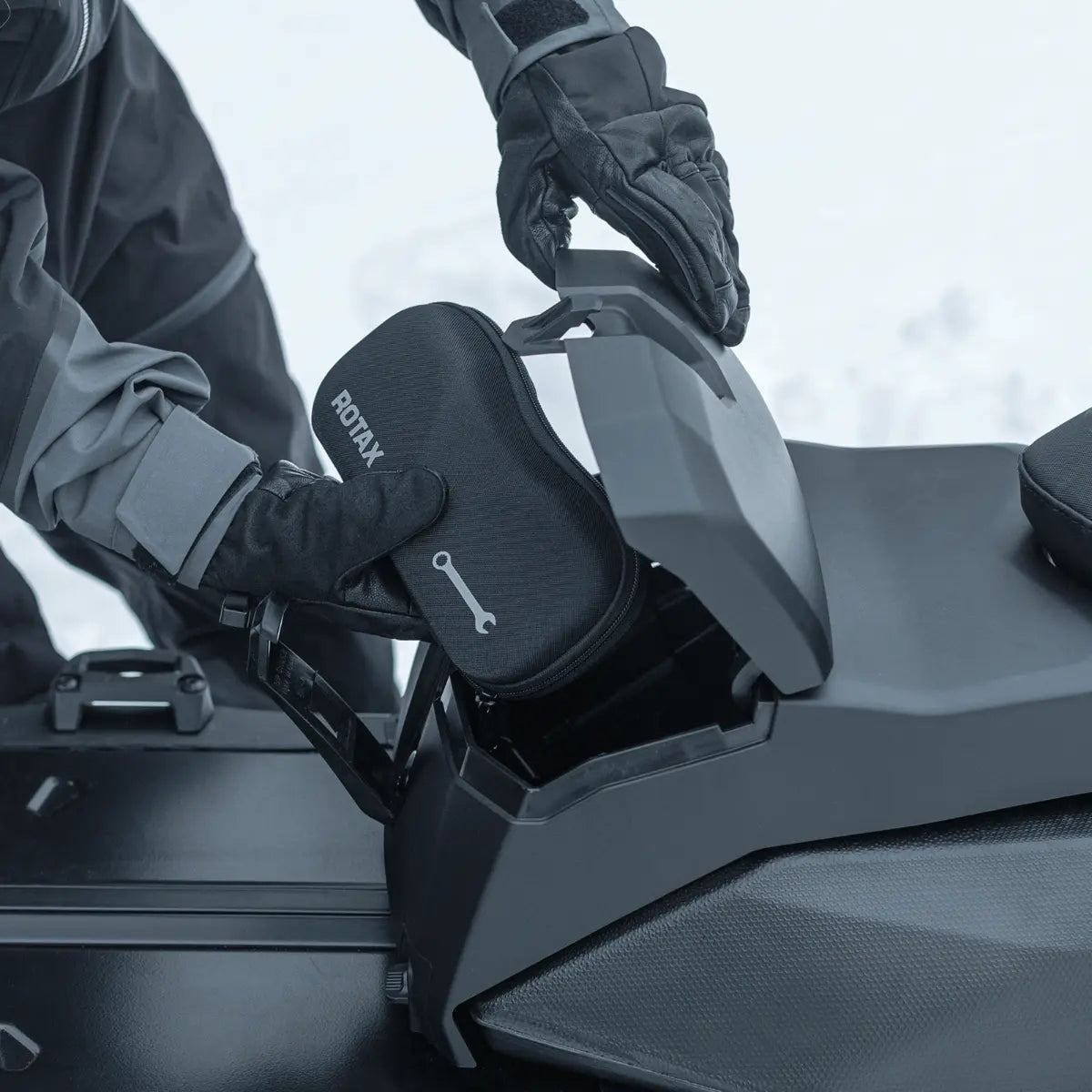 The snowmobile deluxe tool kit is exactly what you need on your next trip. It contains high quality tools such as a stainless steel open end / ring and wrenches, a 1/4 drive ratchet with 4" extension, long noise Vise-Grip and a spring hook tool. The casing fits perfectly in the Seat Storage Box with or without batteries.